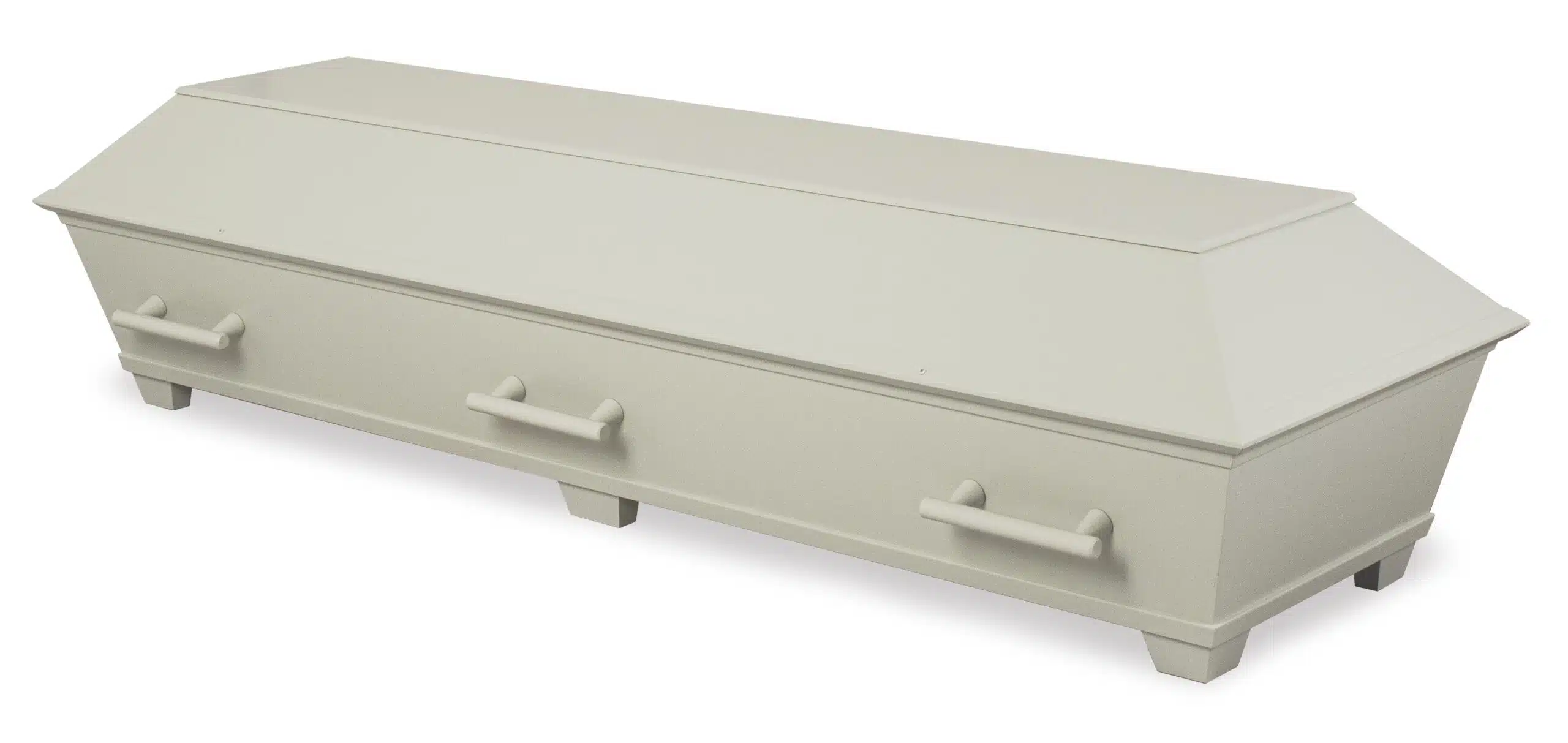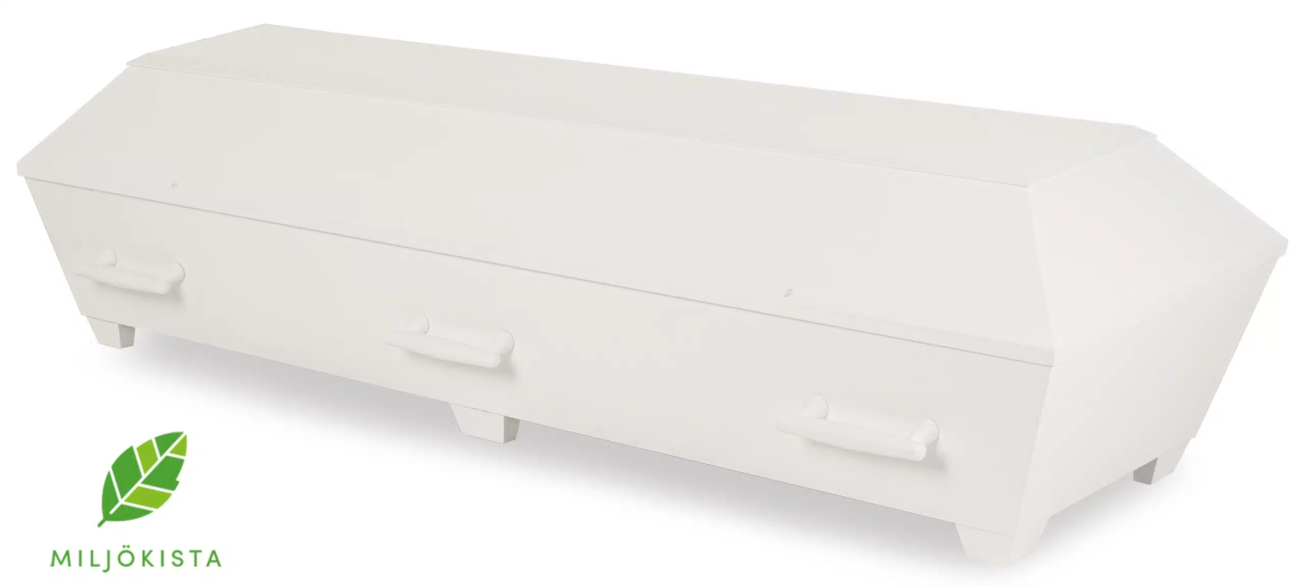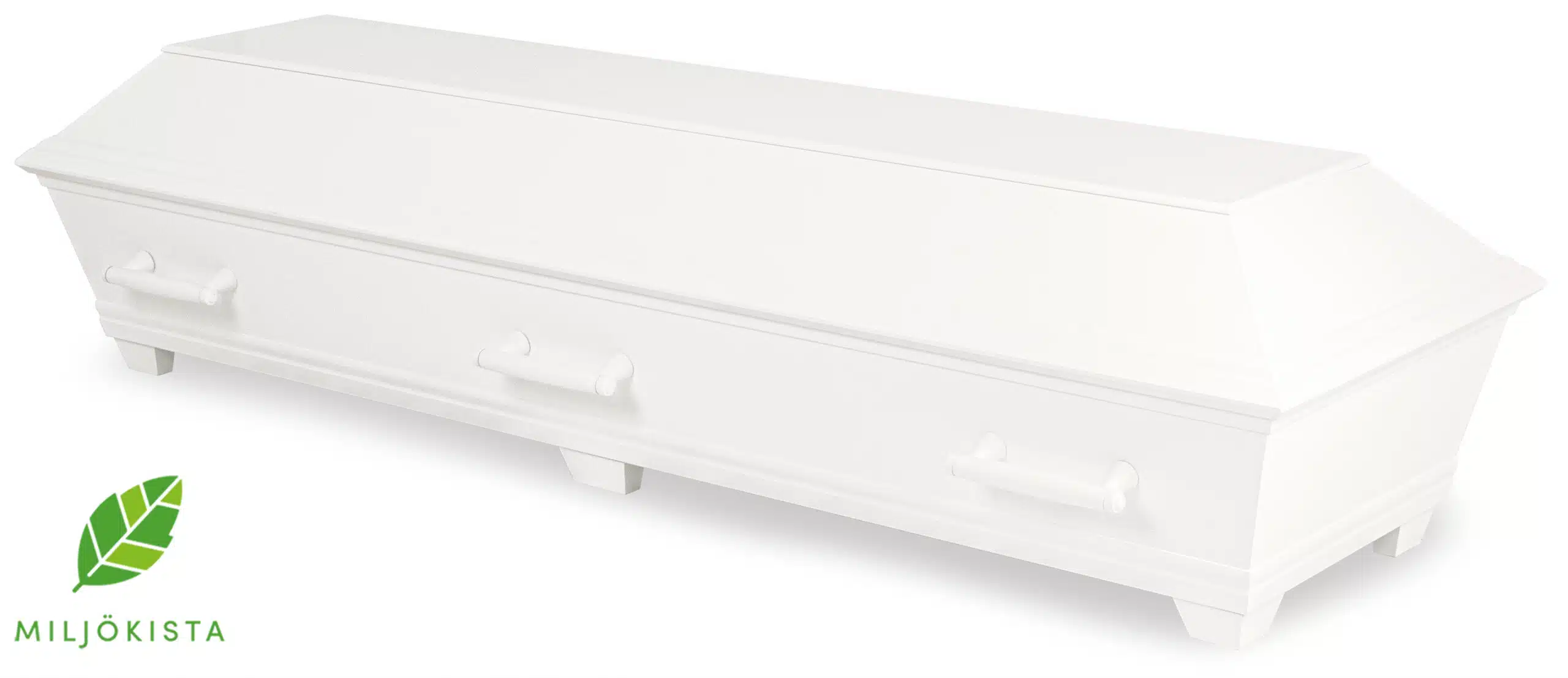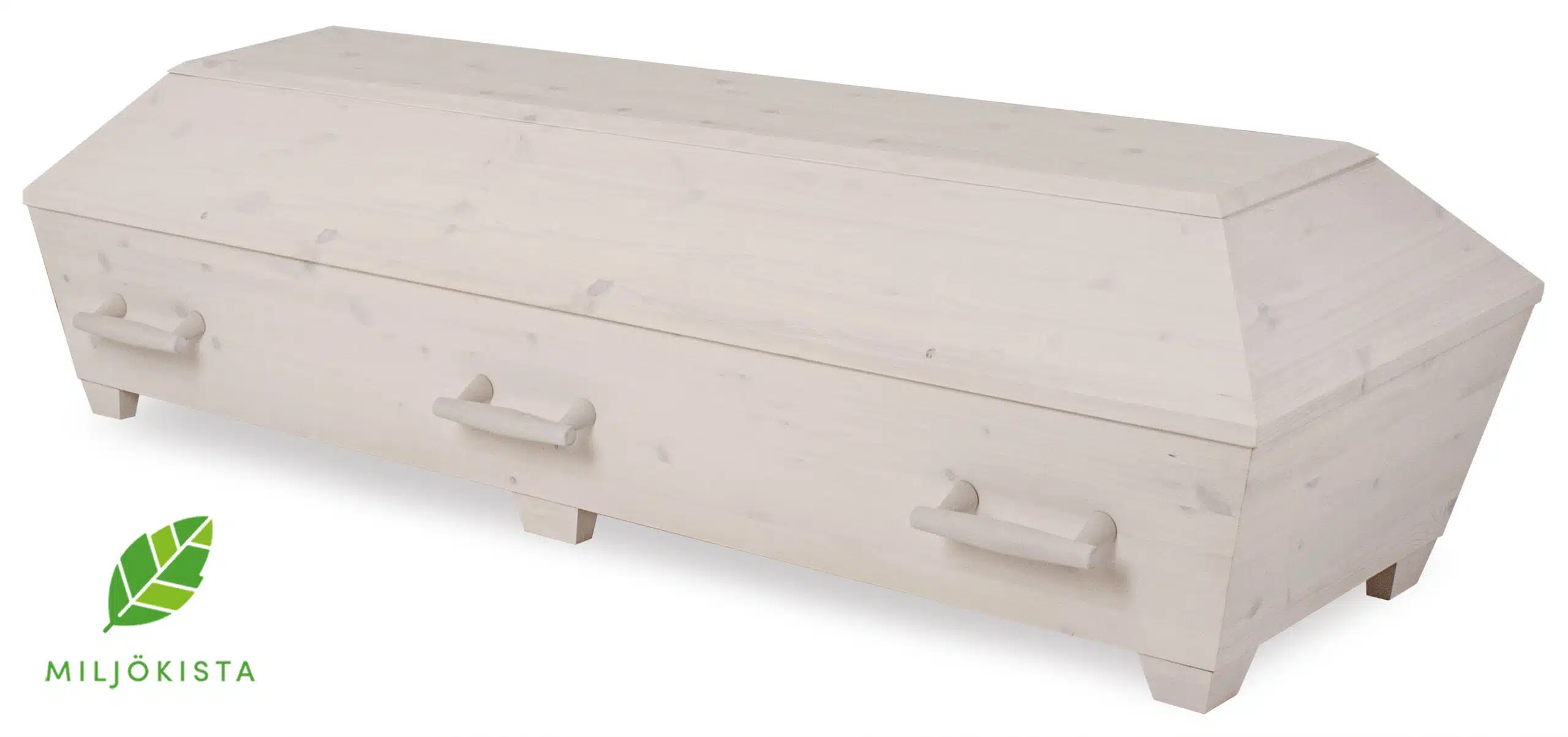 Modern är en kista tillverkad av massiv svensk furu. Denna variant är vitpigmenterad och träets naturliga struktur är synlig.